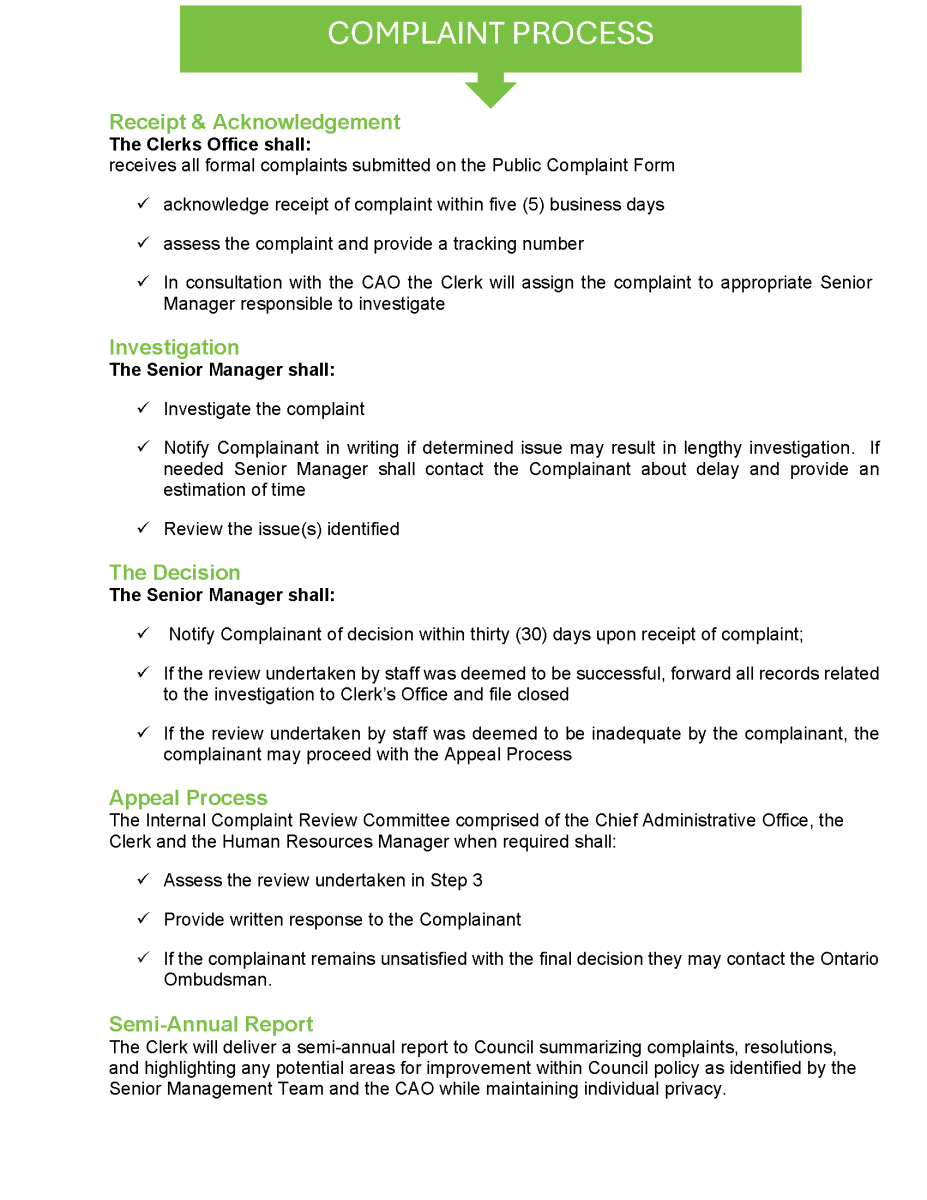 To submit a complaint, please proceed with completing this form: www.fortfrances.ca/customer-complaint-form