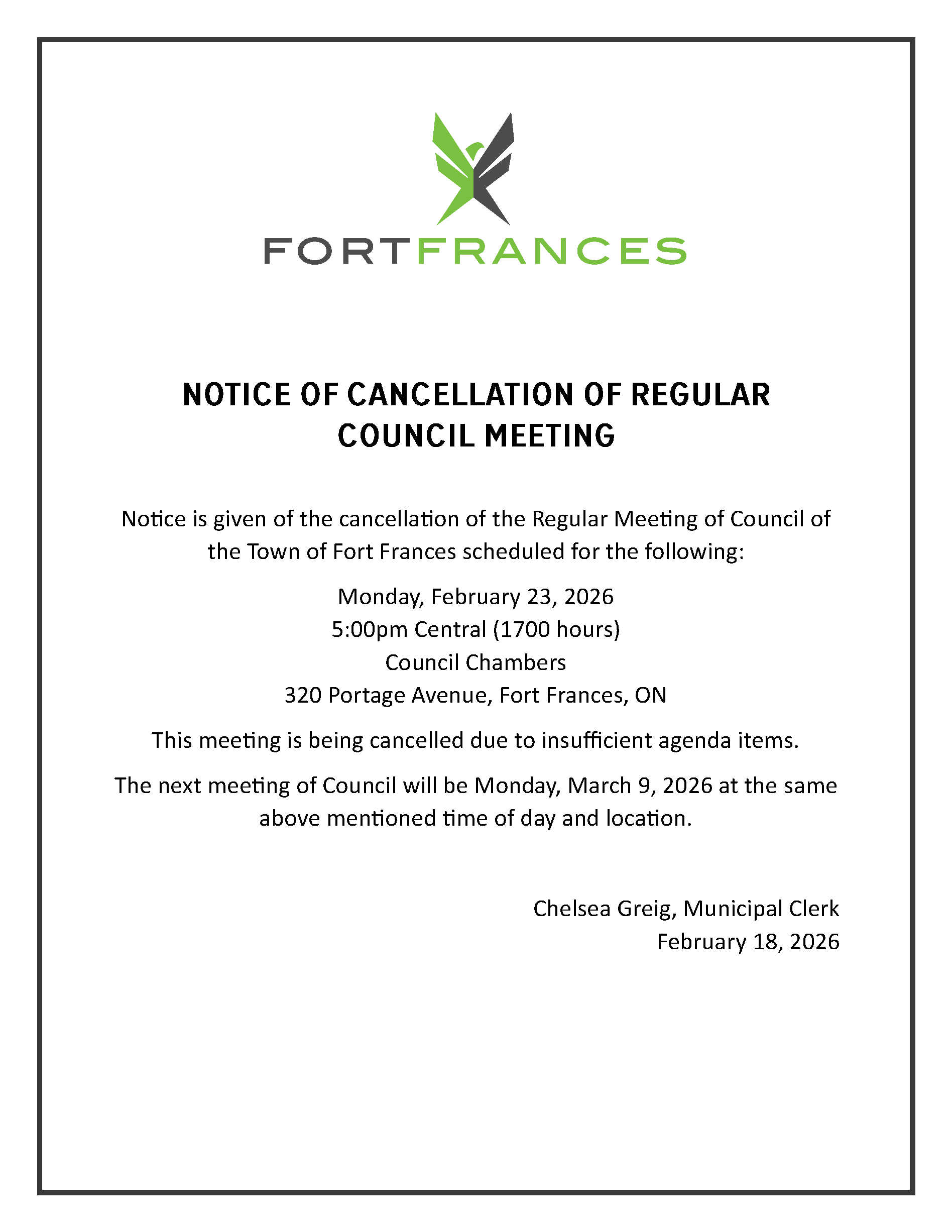Notice is given of the cancellation of the Regular Meeting of Council of the Town of Fort Frances scheduled for the following: