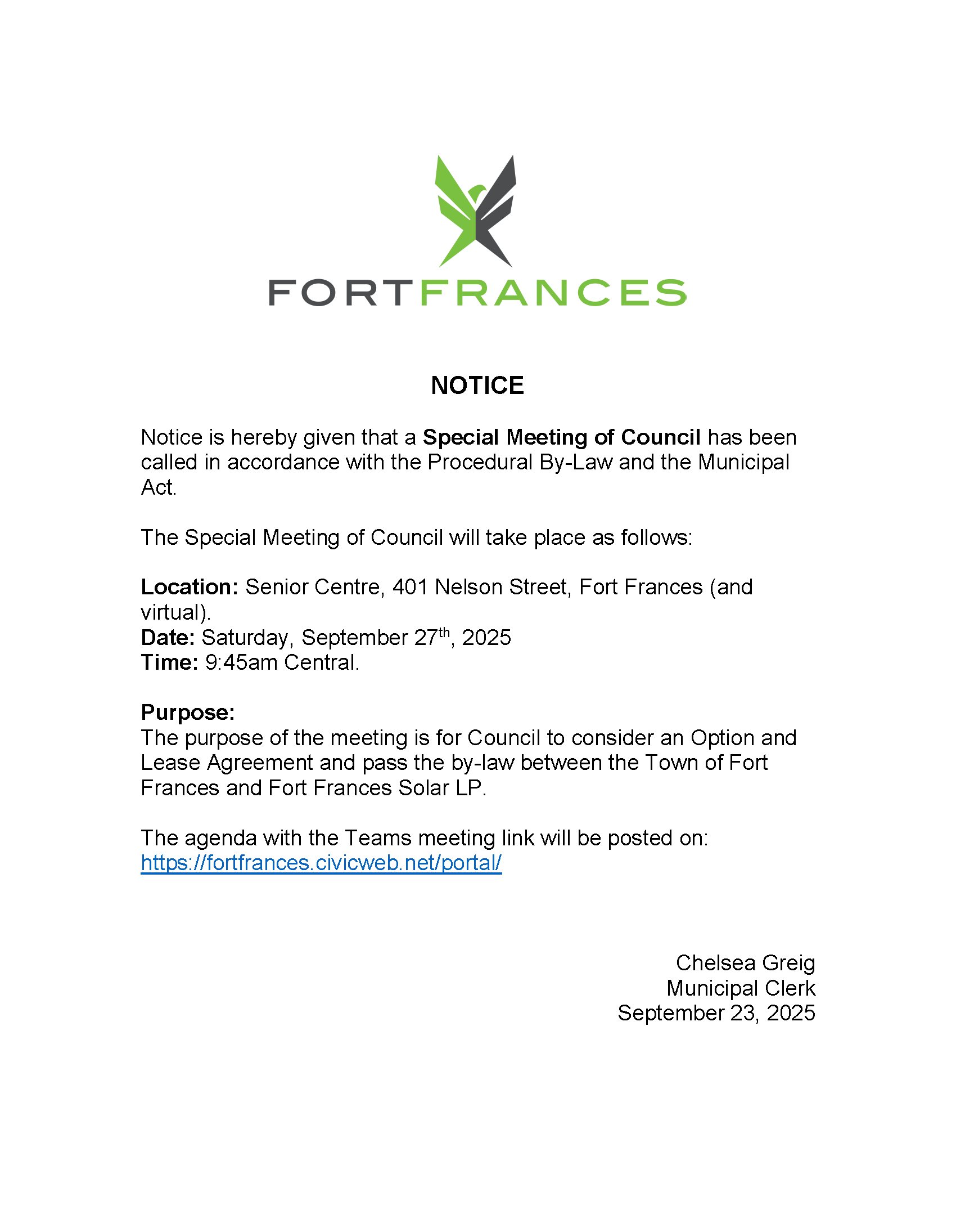 The purpose of the meeting is for Council to consider an Option and Lease Agreement and pass the by-law between the Town of Fort Frances and Fort Frances Solar LP.