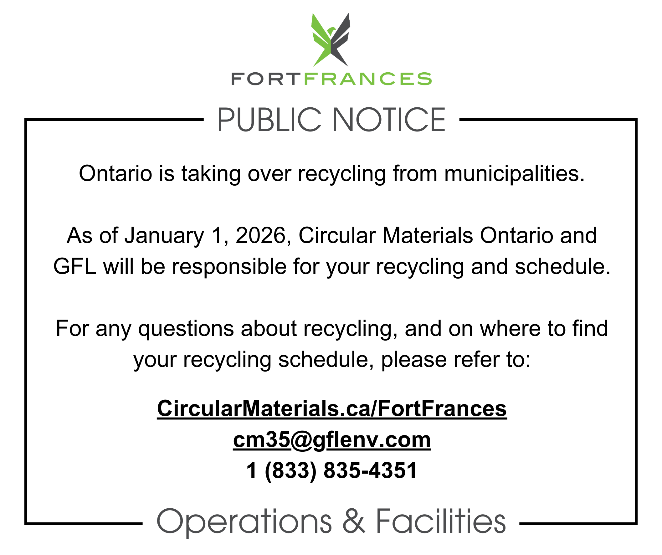 As of January 1, 2026, Circular Materials Ontario and GFL will be responsible for your recycling and schedule.